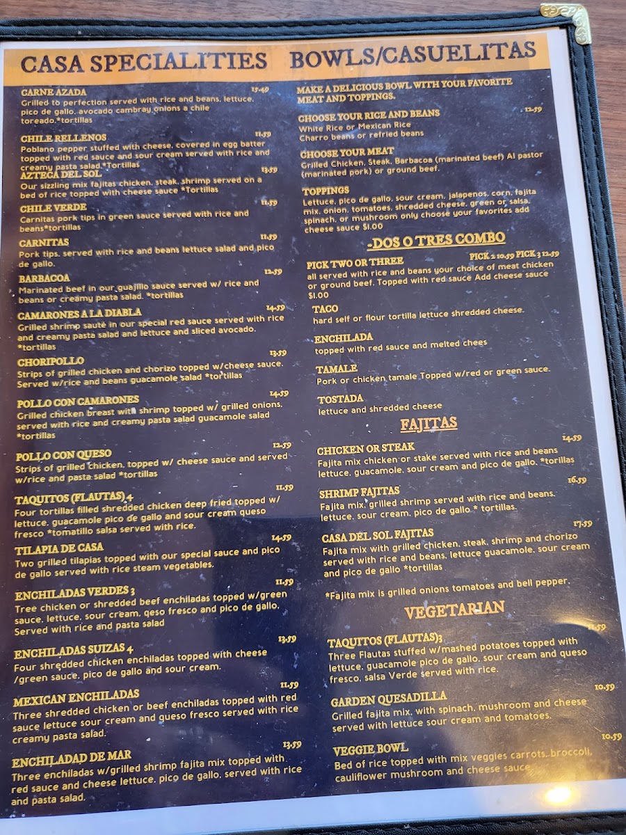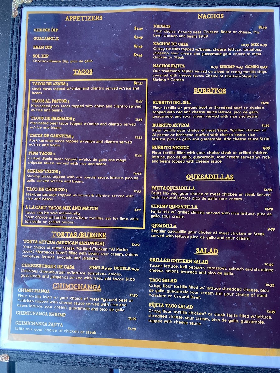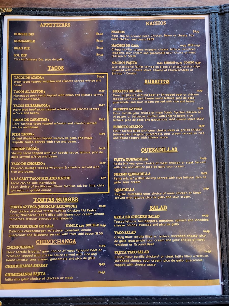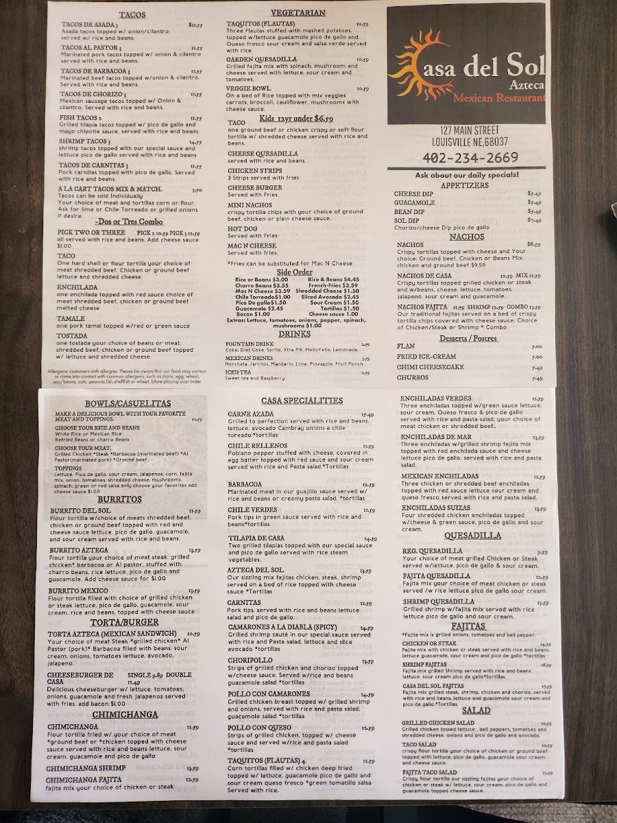 Introducing the menu of Casa Del Sol Azteca, a vibrant addition to Louisville, NE, where authentic Mexican flavors shine. Located at 127 Main St, this charming restaurant offers a welcoming ambiance that's perfect for both casual dining and special gatherings.